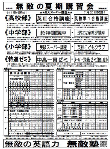 いよいよ受験生にとって、最後の冬がやってきます。無敵塾の冬期講習では、英Ⅲ合格講座などの四大スーパー講座をはじめ、小学生~大学受験生までに必要とされる全ての講座を準備して、お待ちしております。どの講座も短期間に大量の範囲をカバーし、飛躍的成績アップを可能とする講座ばかりです。