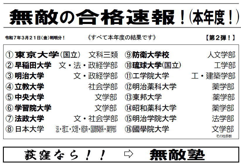 いよいよ受験生にとって、最後の冬がやってきます。無敵塾の冬期講習では、英Ⅲ合格講座などの四大スーパー講座をはじめ、小学生~大学受験生までに必要とされる全ての講座を準備して、お待ちしております。どの講座も短期間に大量の範囲をカバーし、飛躍的成績アップを可能とする講座ばかりです。